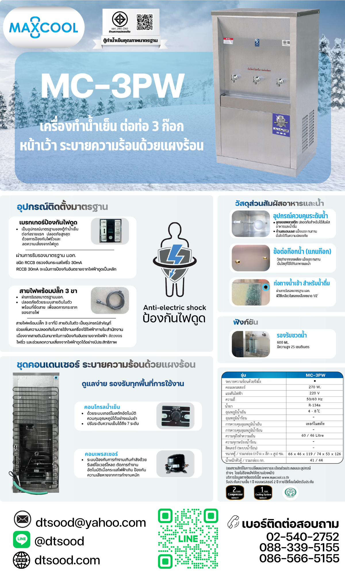 ตู้ทำน้ำเย็น 3 ก๊อก แบบต่อท่อ แผงร้อน MC-3PW